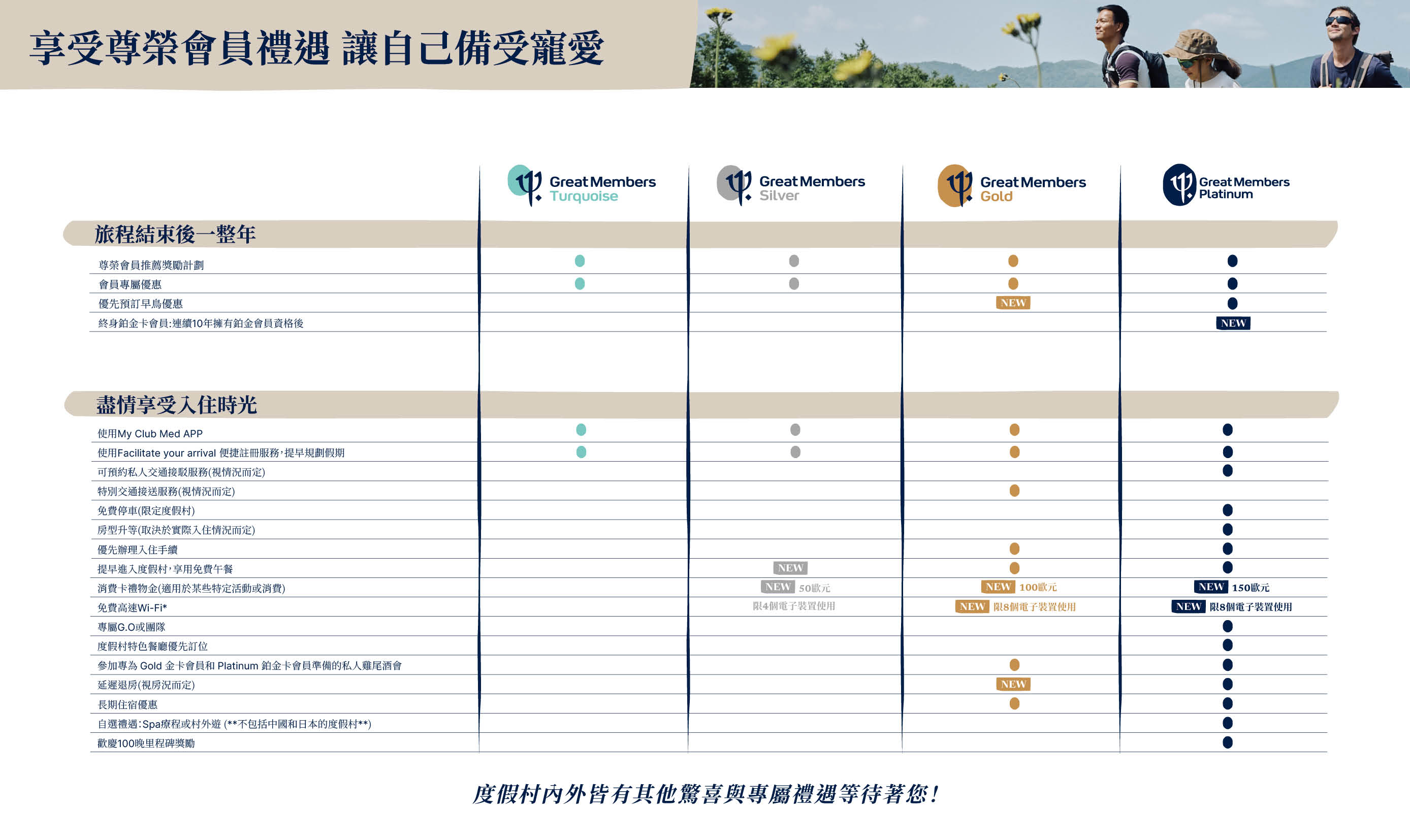 | 取得資格 | 前往過 Club Med 假期即享有 | 10,000 積分 | 27,000 積分 | 55,000 積分 |